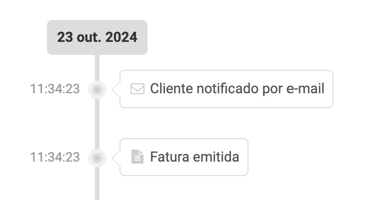 Na página de detalhes de cada encomenda tem disponível uma cronologia de eventos relacionados com a gestão da encomenda, onde pode verificar quando e qual o utilizador que emitiu (caso seja aplicável), adicionou ou removeu uma fatura.