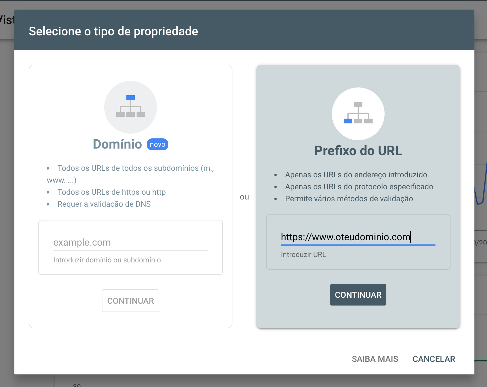 O primeiro passo é escolher o domínio que pretende indexar e monitorizar no Google. Pode escolher entre dois tipos de propriedade: Domínio ou Prefixo de URL. Escolha a opção Prefixo do URL e insira o domínio primário da sua loja online.