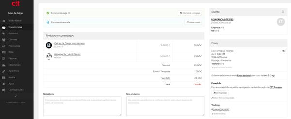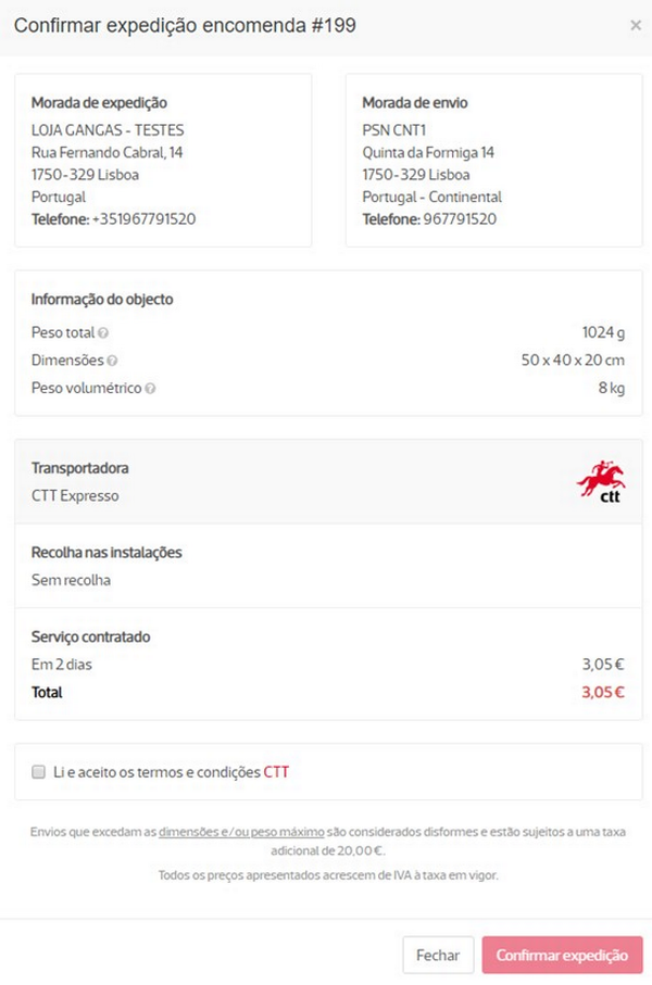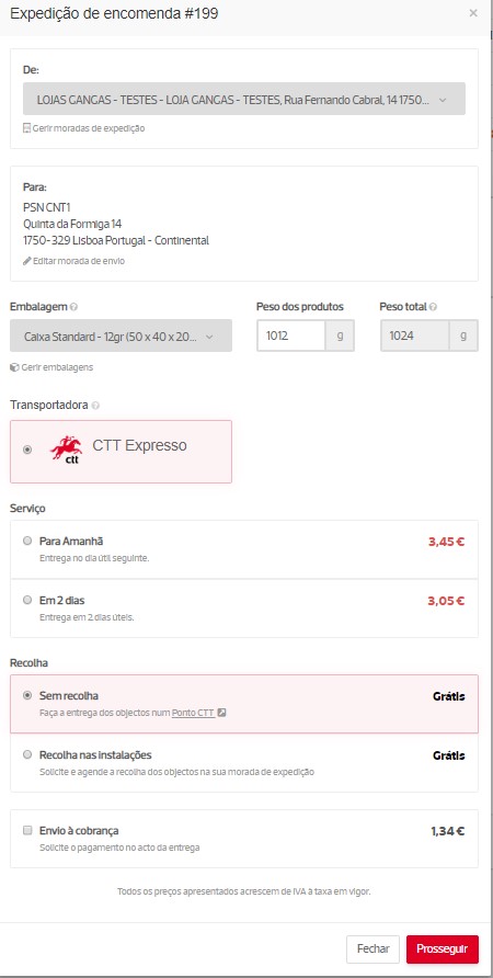 Aceda ao detalhe da encomenda e clique em Expedir encomenda. Neste passo, deverá selecionar o serviço de expedição a utilizar e se pretende serviços adicionais e recolha.