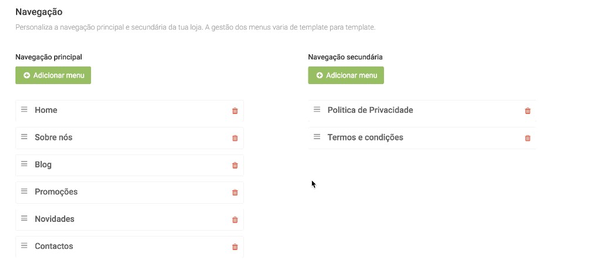 Pode personalizar a navegação principal e secundária da sua loja. Adicionar, remover e alterar a posição dos menus da sua loja é muito fácil.