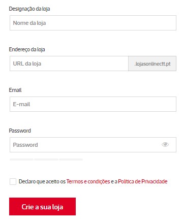Ao efetuar o registo na plataforma Criar Lojas Online, deve preencher os campos Designação da loja, Endereço da loja, Email e Password.