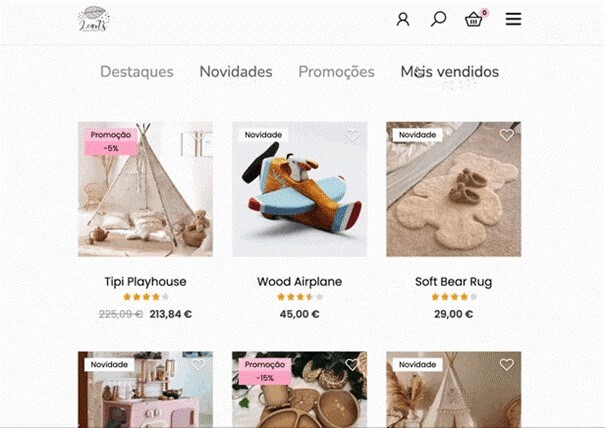 Na secção Mais vendidos são apresentados os produtos com mais vendas. Se não existirem vendas, é apresentada uma listagem de produtos da loja.