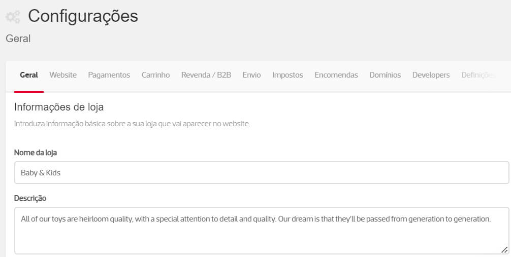 O título de boas-vindas é preenchido com o nome da loja definido no menu Configurações / Geral, na secção Informações de loja, no campo Nome da loja.