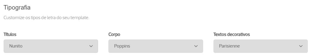 No menu Aparência / Personalização, na secção Tipografia, pode alterar os tipos de letra utilizados neste template. Pode escolher a tipografia dos títulos (ex. títulos de páginas e de produtos), corpo (ex. descrição de produtos) e textos decorativos (ex. texto de boas-vindas).
