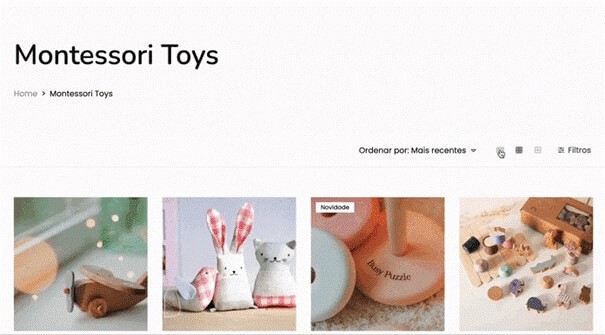 - Número de colunas: o visitante pode optar por visualizar a listagem de produtos organizados em 5, 4 ou 3 colunas;
