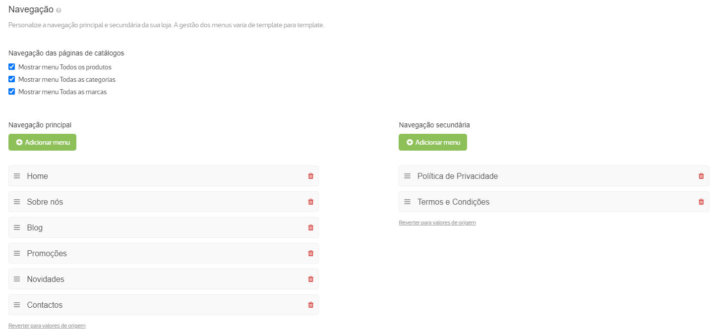 No menu Aparência / Personalização, na secção Navegação, pode configurar os menus de navegação da loja online.