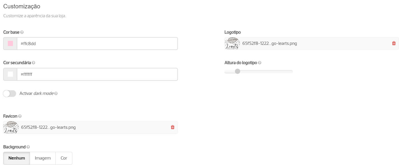 - Background: defina o preenchimento do fundo da loja, sendo possível optar por adicionar uma imagem, uma cor ou nenhum background