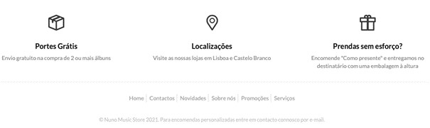 As redes sociais, que podem ser configuradas no menu Configurações / Geral, surgem como ícones na homepage e, também, na página de Contactos da loja online.