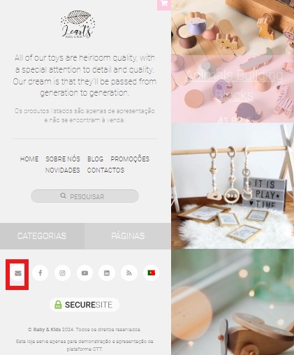 No menu Configurações / Website pode configurar o anúncio de loja e o texto de rodapé. O anúncio de loja pode ser utilizado para comunicar alguma novidade, promoção ou serviço, enquanto o texto de rodapé pode ser utilizado para fazer algum aviso ou fornecer informações sobre a loja online.