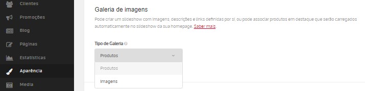 Pode optar por apresentar imagens dos seus produtos em destaque no slideshow. Para isso, na configuração da galeria de imagens, escolha a opção Produtos no campo Galeria de Imagens.