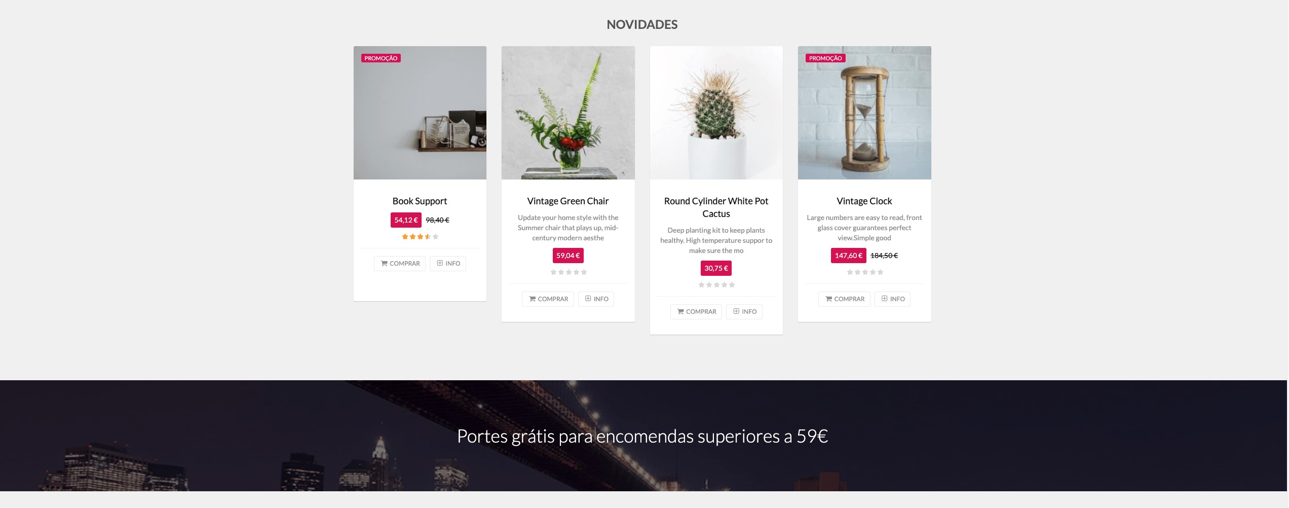 O anúncio de loja, neste template, irá surgir na homepage abaixo da secção Novidades. E o texto de rodapé é adicionado no rodapé da loja online.